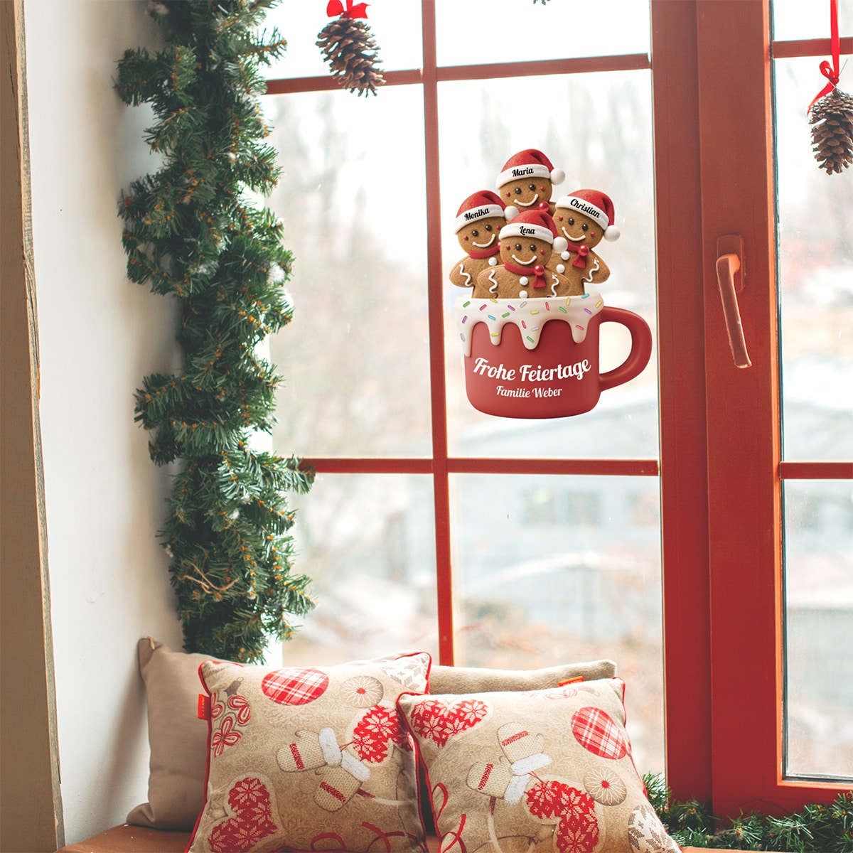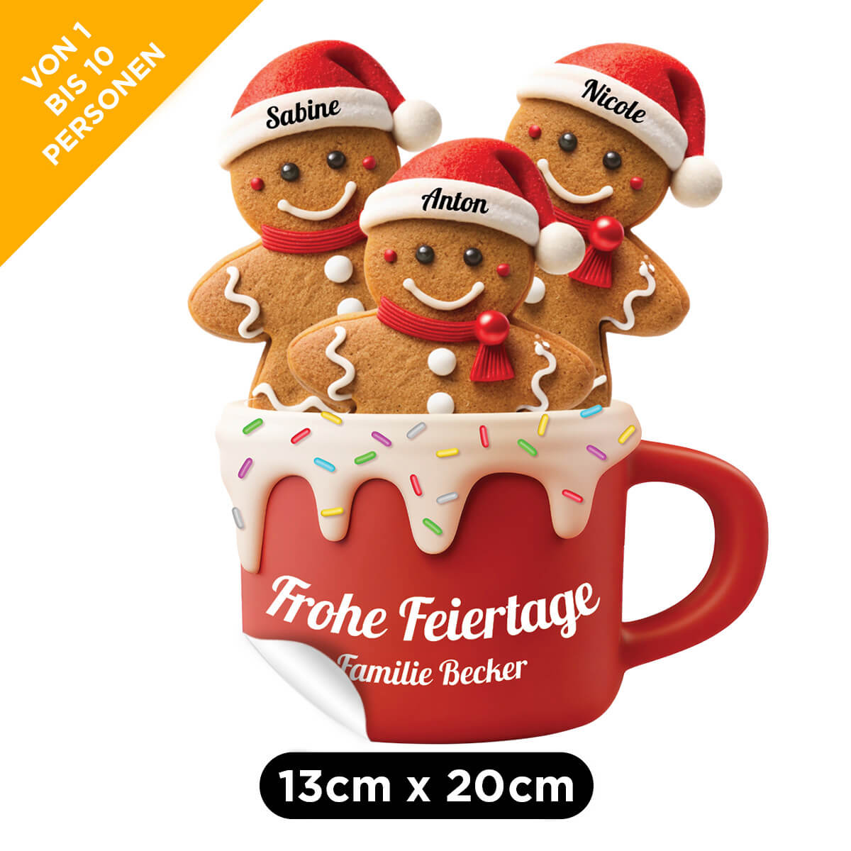 Bis zu 10 Familienmitglieder. Jede Person erhält ihren eigenen personalisierten Lebkuchen mit ihrem Namen auf der Weihnachtsmütze!
